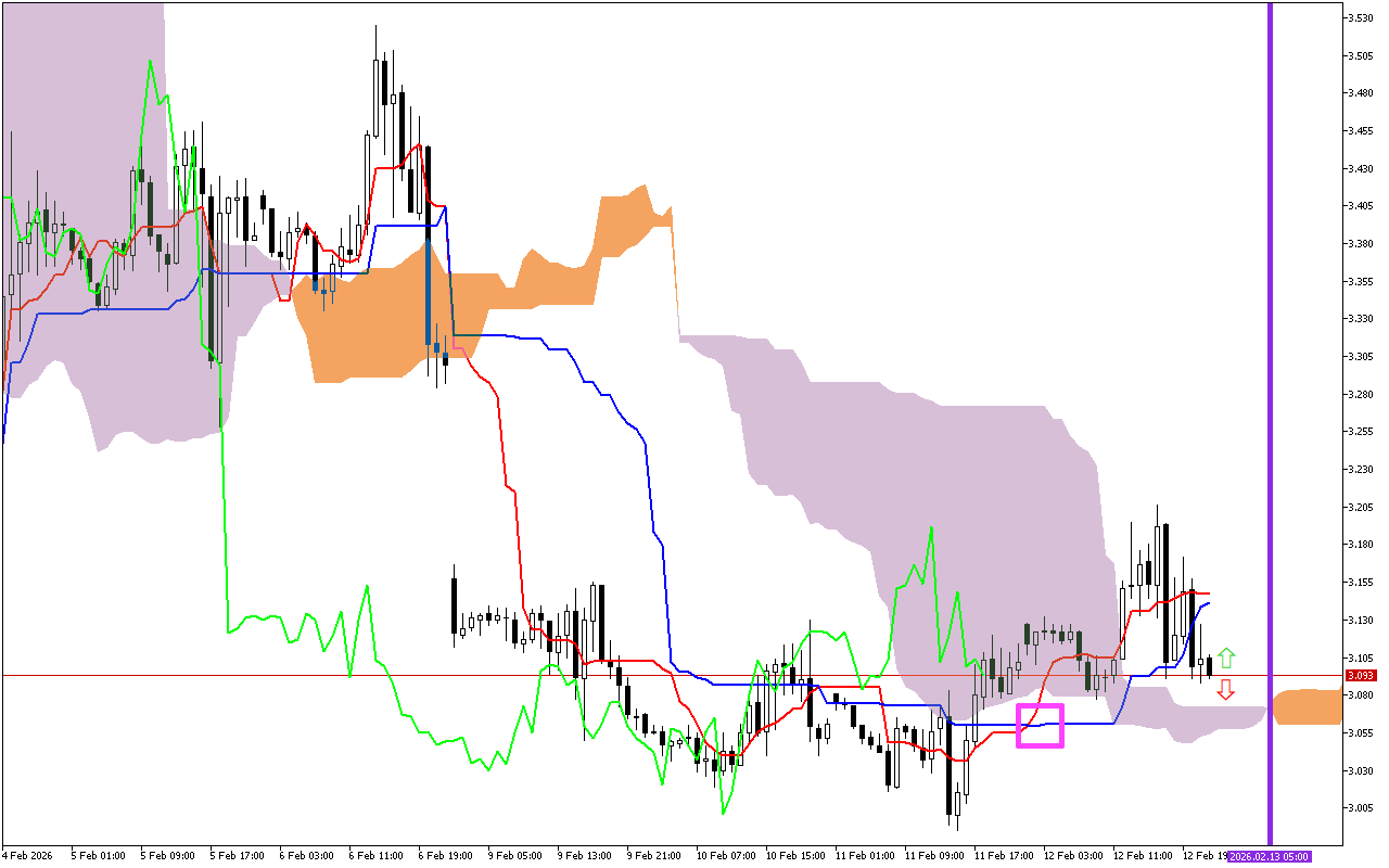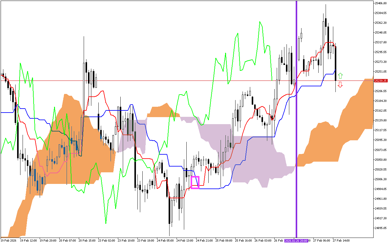 В текущем срезе рынка цена закрепилась ниже облака Kumo. Границы облака образуют динамическую зону сопротивления для цены.
