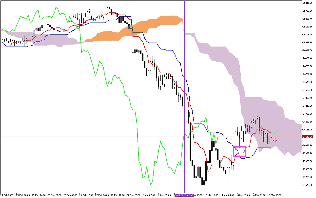 Сейчас мы видим сиреневый оттенок облака Kumo, что указывает на возможное изменение динамики цен в негативном направлении.