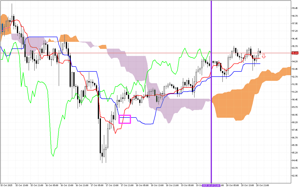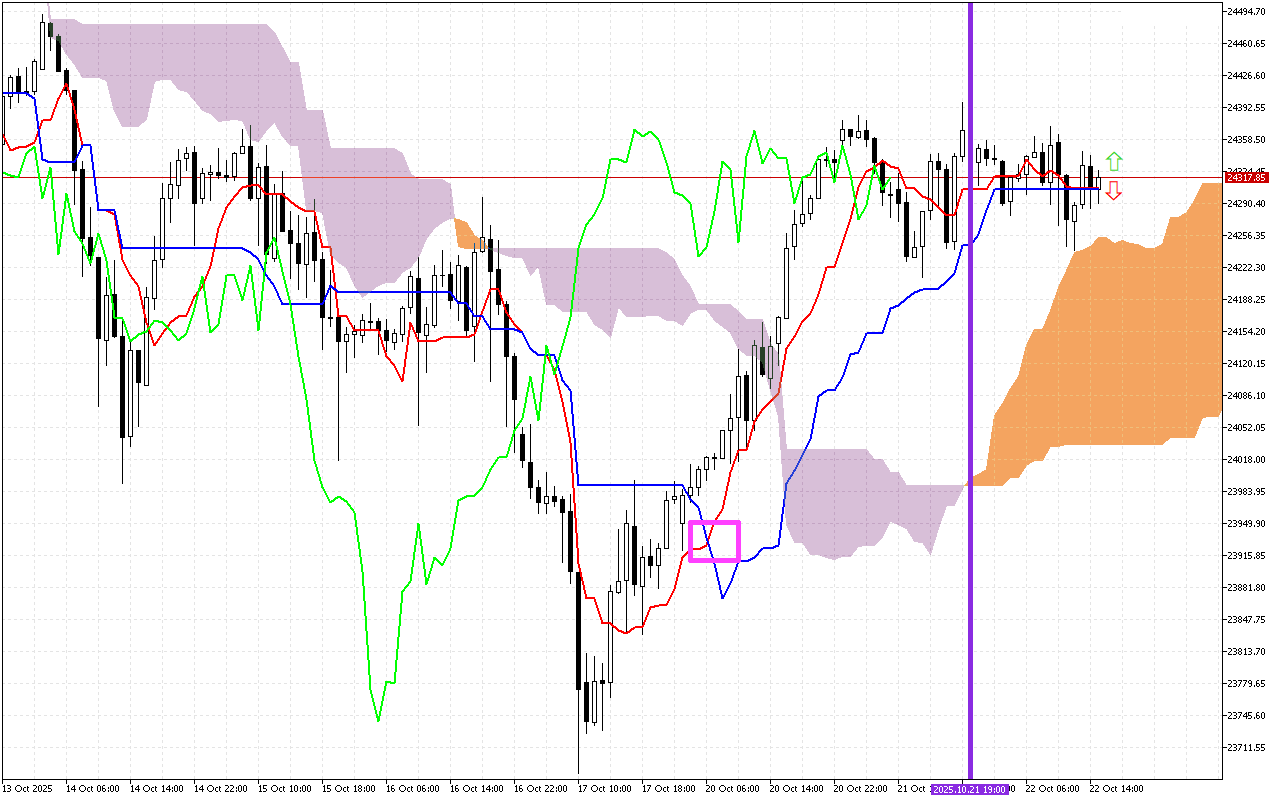 Главным сигналом последних торговых сессий является пересечение линий Tenkan и Kijun, обозначенное на графике розовым квадратом. Это негативный сигнал, указывающий на смену предстоящей тенденции на нисходящую.
