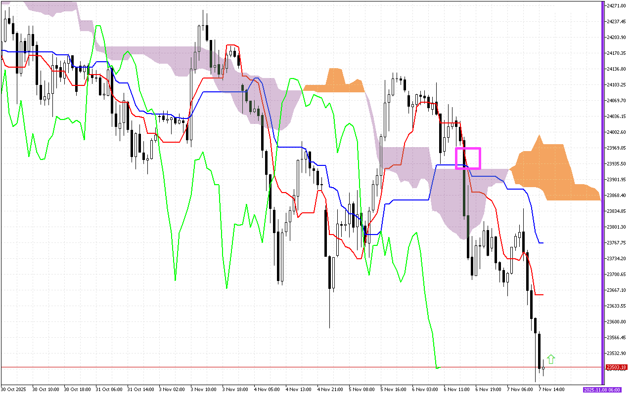 Облако Kumo окрашено в сиреневый цвет, что указывает на приоритет нисходящего вектора движения цены.