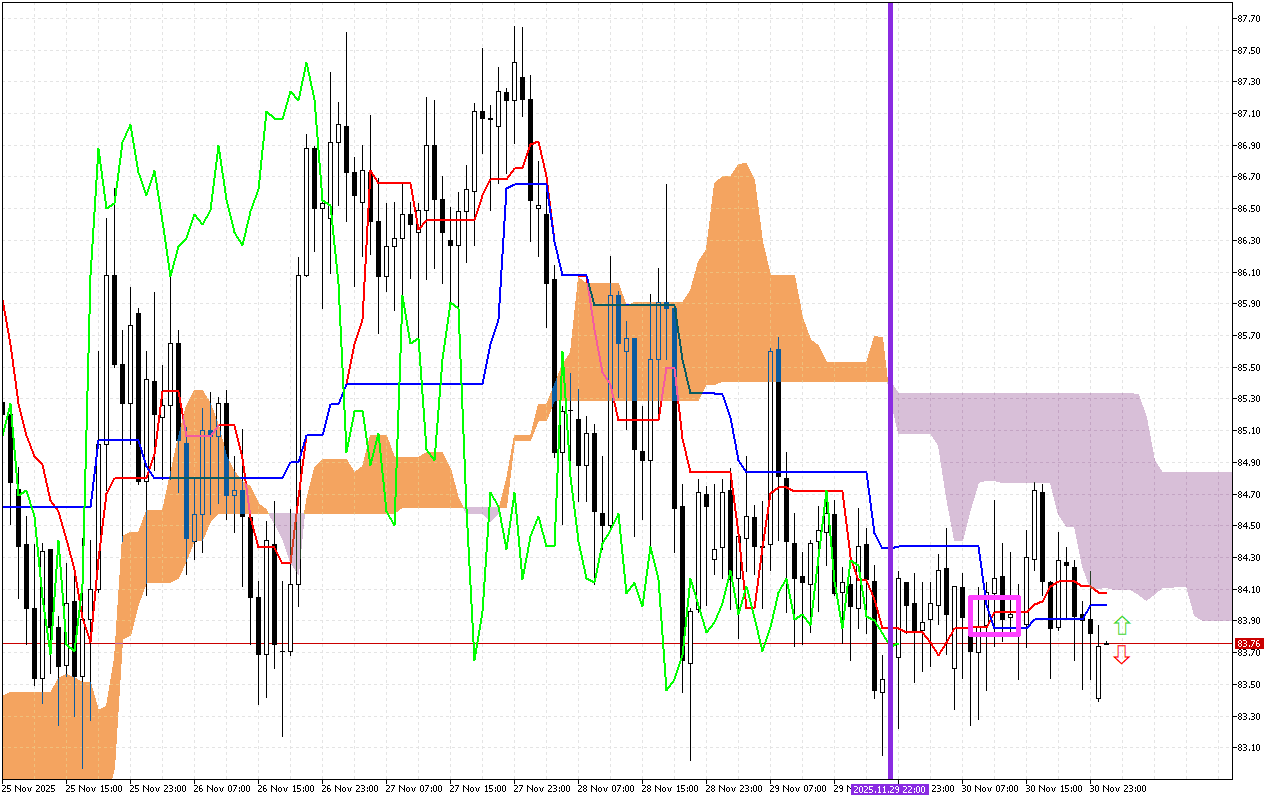 Одним из основных сигналов предыдущих сессий торгов стало пересечение линий Tenkan и Kijun. На графике это место отмечено розовым квадратом. Подъем линии Tenkan выше Kijun является позитивным сигналом, который может свидетельствовать о возможной смене тенденции на восходящую.