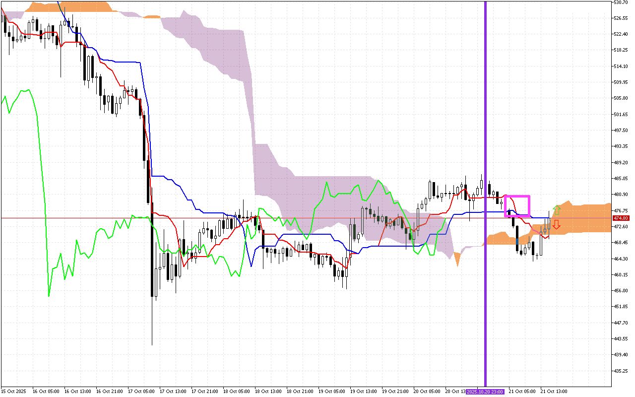Вторым важным сигналом является изменение направления движения облака Kumo. Этот момент на графике обозначен вертикальной фиолетовой линией. Появление оранжевого цвета в облаке свидетельствует о смене основного направления движения на восходящее.
