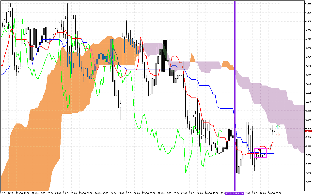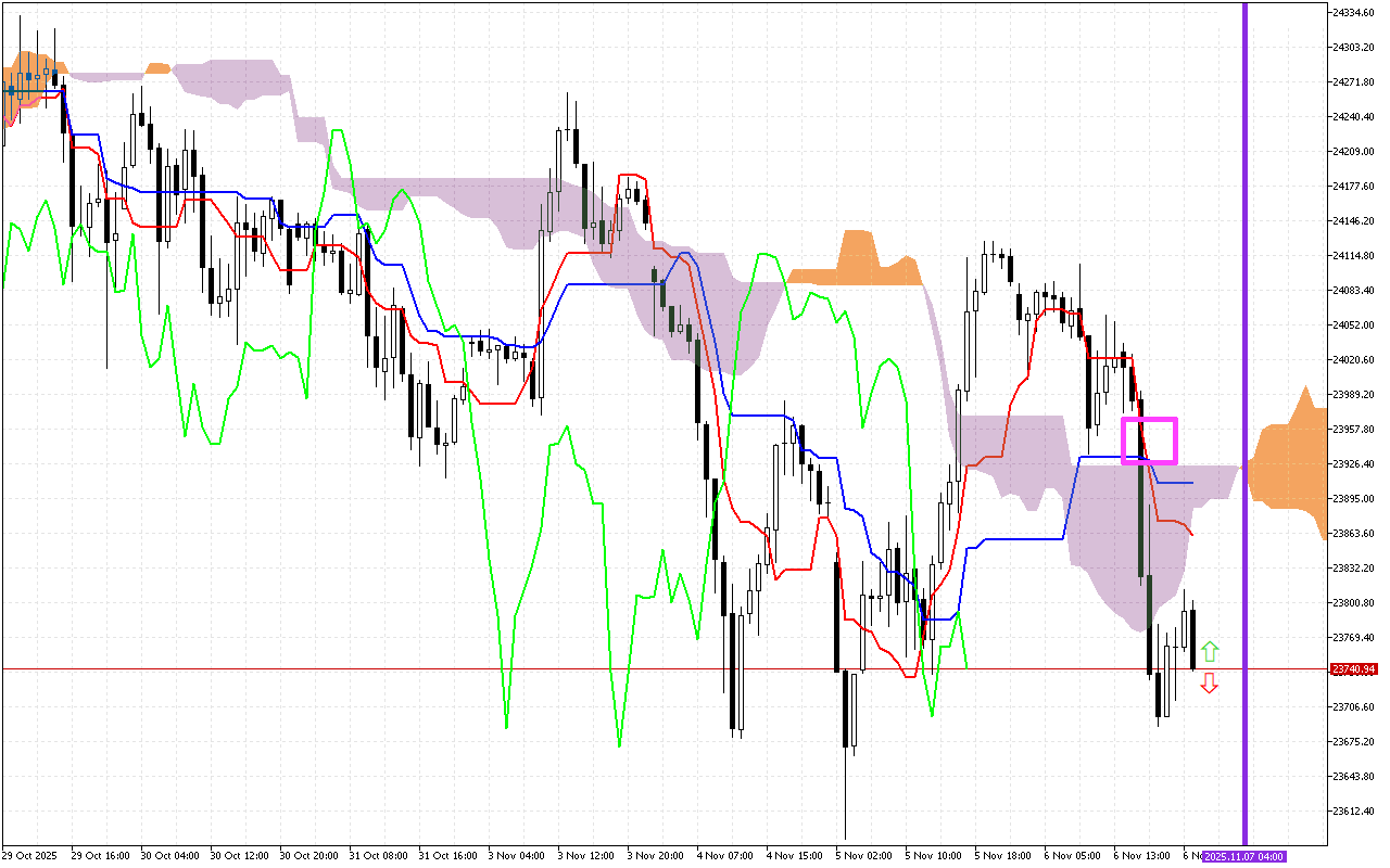 Наиболее значимым сигналом предшествующих торговых сессий стало пересечение линий Tenkan и Kijun, что рассматривается как сигнал смены тенденции на рынке.