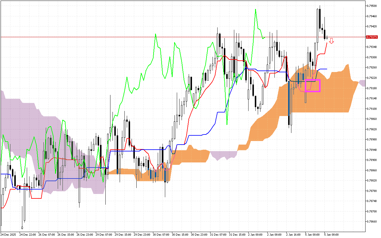 Наиболее значимым сигналом предшествующих торговых сессий стало пересечение линий Tenkan и Kijun, что рассматривается как сигнал смены тенденции на рынке.