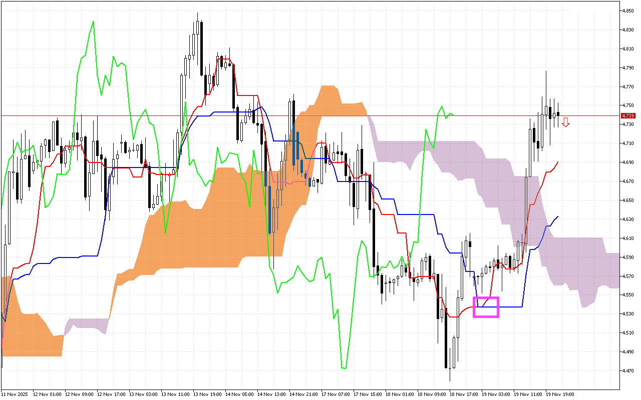 Одним из основных сигналов предыдущих сессий торгов стало пересечение линий Tenkan и Kijun. На графике это место отмечено розовым квадратом. Подъем линии Tenkan выше Kijun является позитивным сигналом, который может свидетельствовать о возможной смене тенденции на восходящую.