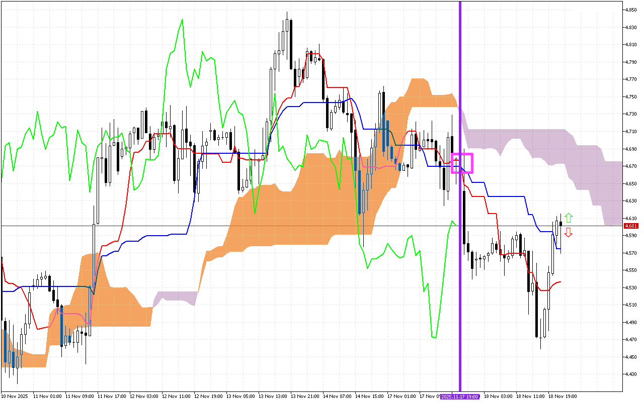Одним из основных сигналов предыдущих сессий торгов стало пересечение линий Tenkan и Kijun. На графике это место отмечено розовым квадратом. Подъем линии Tenkan выше Kijun является позитивным сигналом, который может свидетельствовать о возможной смене тенденции на восходящую.
