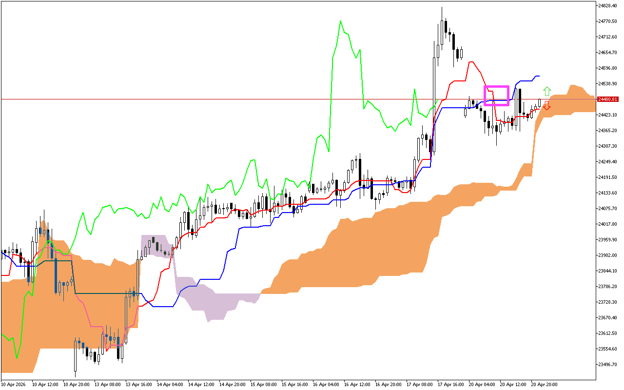Облако Kumo окрашено в оранжевый цвет, что указывает на склонность рынка к продолжению восходящего движения.