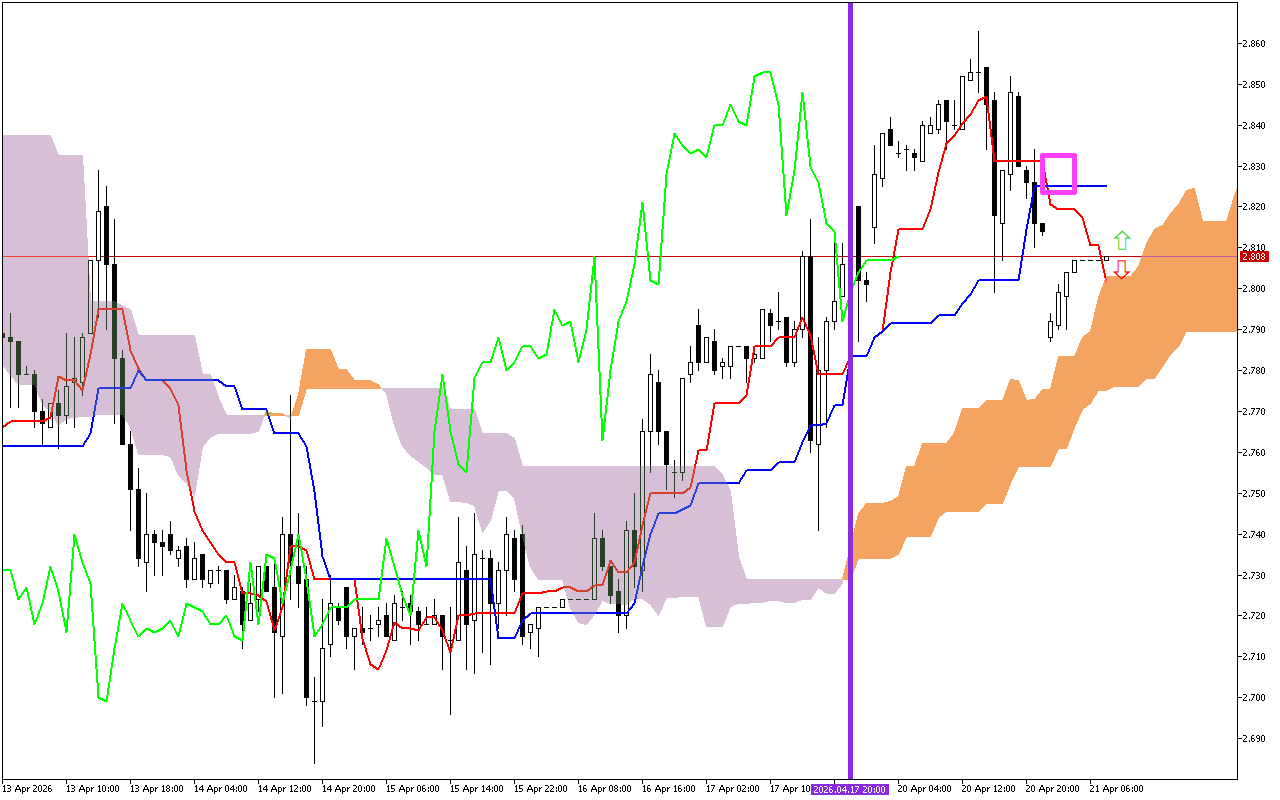Динамические уровни поддержки находятся на линиях SenkouA, на уровне 2.798 и SenkouB, около 2.775.