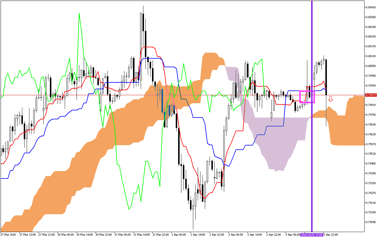 กลุ่มเมฆ Kumo เป็นสีม่วง ซึ่งบ่งบอกถึงลำดับความสำคัญของเวกเตอร์ขาลงของการเคลื่อนไหวของราคา