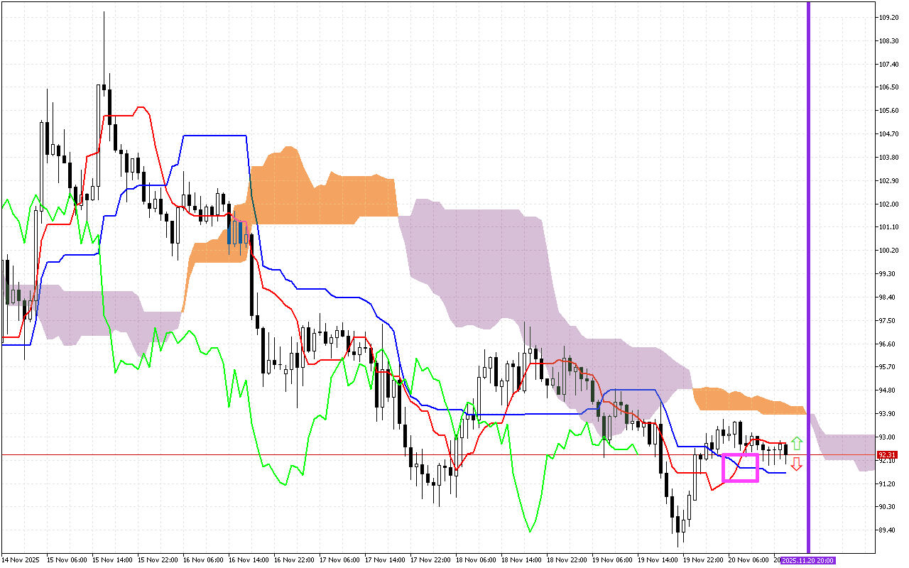 การวิเคราะห์สถานการณ์ตลาดที่พัฒนาขึ้นในช่วงการซื้อขายก่อนหน้านี้ แสดงให้เห็นจุดตัดกันของเส้น Tenkan และ Kijun โดยทั่วไป สัญญาณนี้บ่งบอกถึงการเพิ่มขึ้นที่จะเกิดขึ้น แต่ในเวลาต่อมา ราคาได้ตกลงมาต่ำกว่าเส้น Tenkan