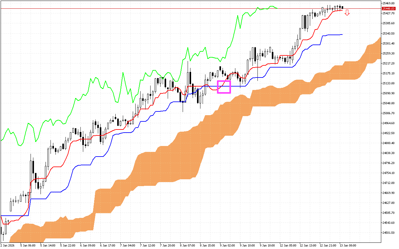 สัญญาณสำคัญประการที่สองคือการเปลี่ยนแปลงสีของกลุ่มเมฆ Kumo ซึ่งทำเครื่องหมายไว้บนกราฟด้วยเส้นสีม่วงแนวตั้ง การปรากฏตัวของสีม่วงในก้อนเมฆบ่งบอกถึงการเปลี่ยนแปลงในทิศทางลำดับความสำคัญของการเคลื่อนที่ลง