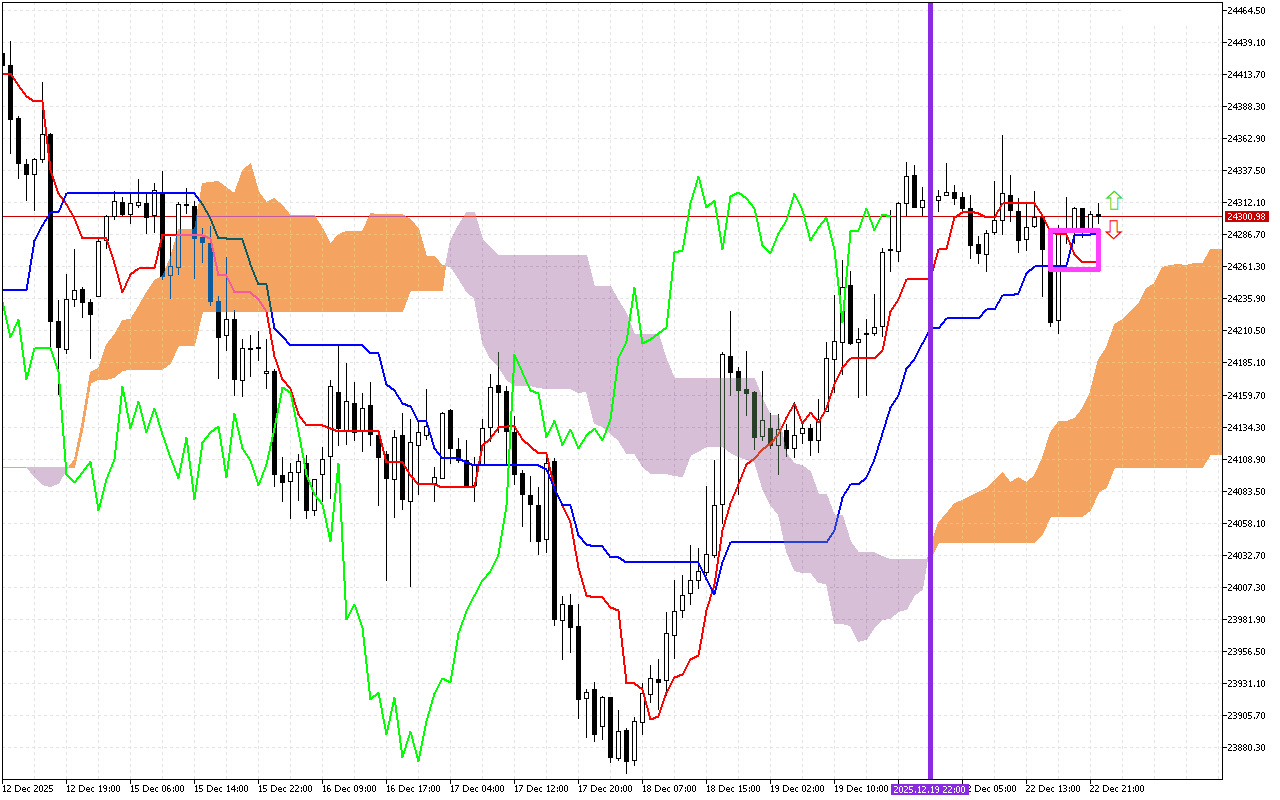 ราคาอยู่ระหว่างเส้น SenkouA และ SenkouB ดังนั้นตอนนี้เส้นเหล่านี้จึงทำหน้าที่เป็นแนวรับและแนวต้าน เพื่อชี้แจงสถานการณ์ของตลาด ควรรอให้ราคาหลุดจากขีดจำกัดของกลุ่มเมฆ Kumo