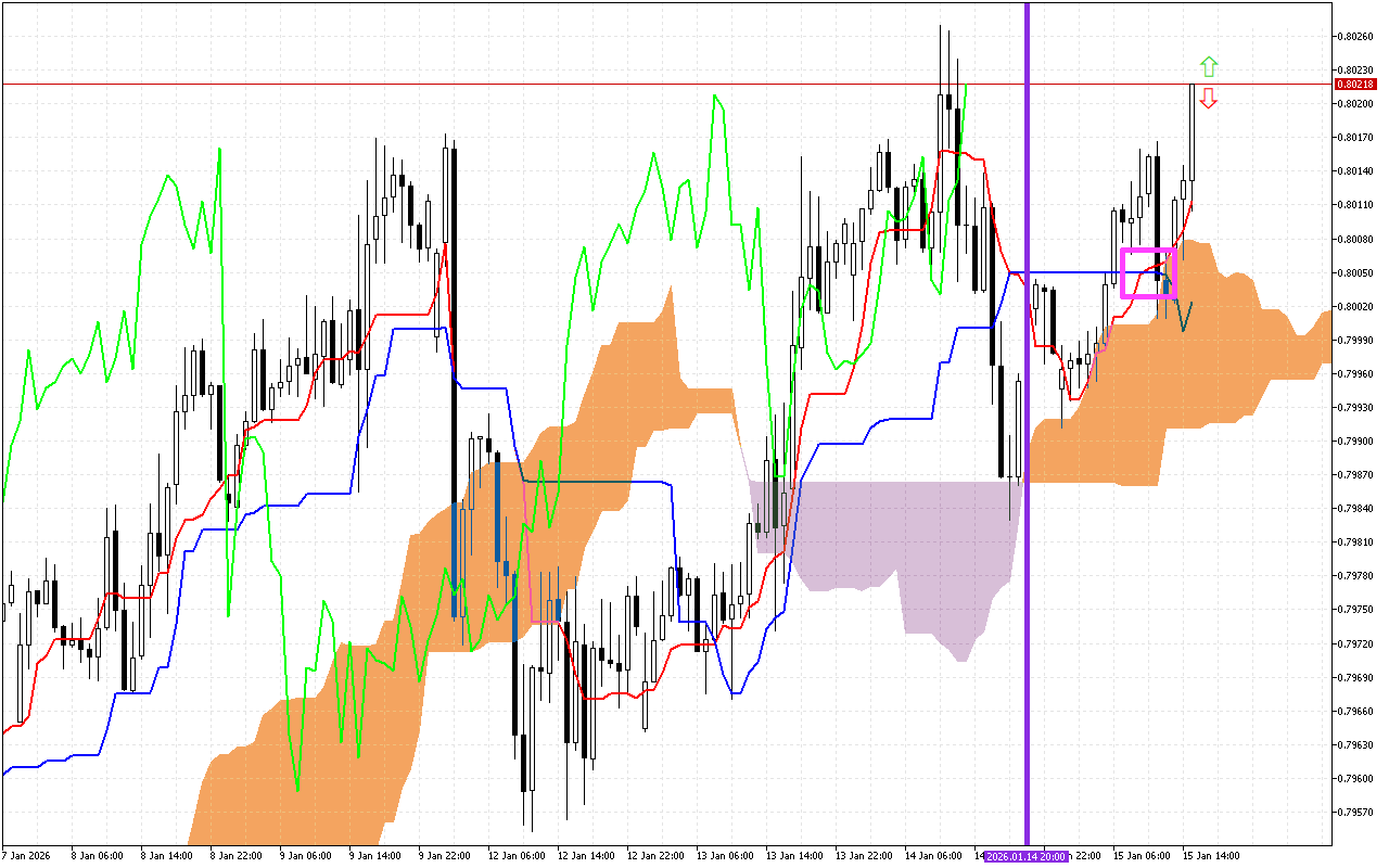 อำนาจของการเคลื่อนไหวของราคาในระยะทางไกลนั้นถูกกำหนดโดยกลุ่มเมฆ Kumo ซึ่งขณะนี้มีสีส้ม ดังนั้น สัญญาณนี้จึงให้ความสำคัญกับเวกเตอร์การเคลื่อนไหวของราคาในทิศทางขาขึ้นในอนาคต