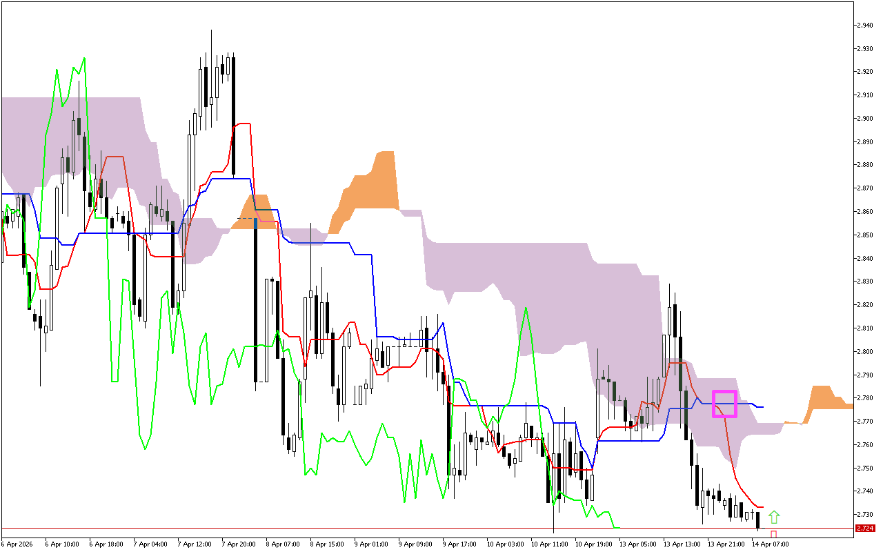สัญญาณที่สำคัญที่สุดจากการซื้อขายในช่วงก่อนหน้านี้คือการตัดกันของเส้น Tenkan และ Kijun ซึ่งถือเป็นสัญญาณของการเปลี่ยนแปลงแนวโน้มในตลาด