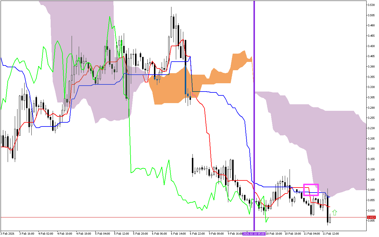 กลุ่มเมฆ Kumo เป็นสีม่วง ซึ่งบ่งบอกถึงลำดับความสำคัญของเวกเตอร์ขาลงของการเคลื่อนไหวของราคา