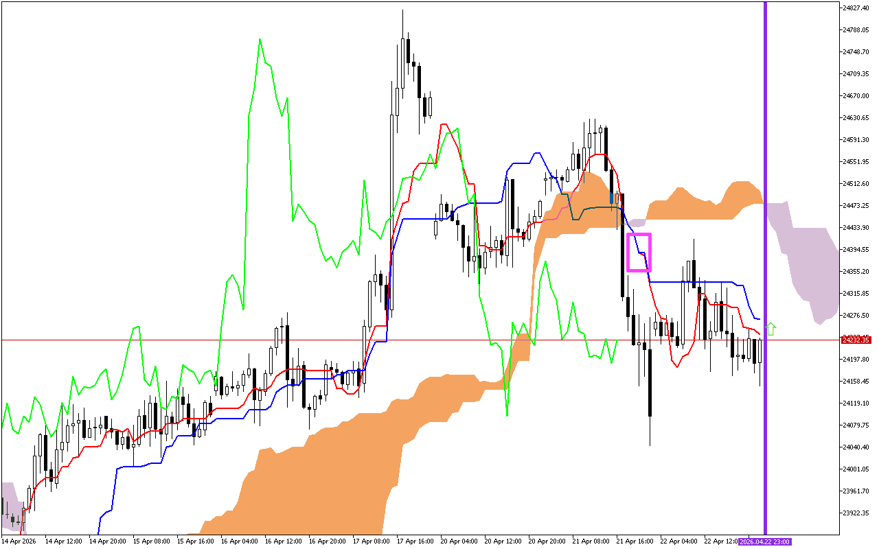 ระดับแนวต้านมีการเคลื่อนไหวอยู่บนเส้น Tenkan ในพื้นที่ของ 24250.60, Kijun ใกล้กับ 24271.01, SenkouA, ระดับ 24507.26 และ SenkouB รอบ ๆ 24476.21