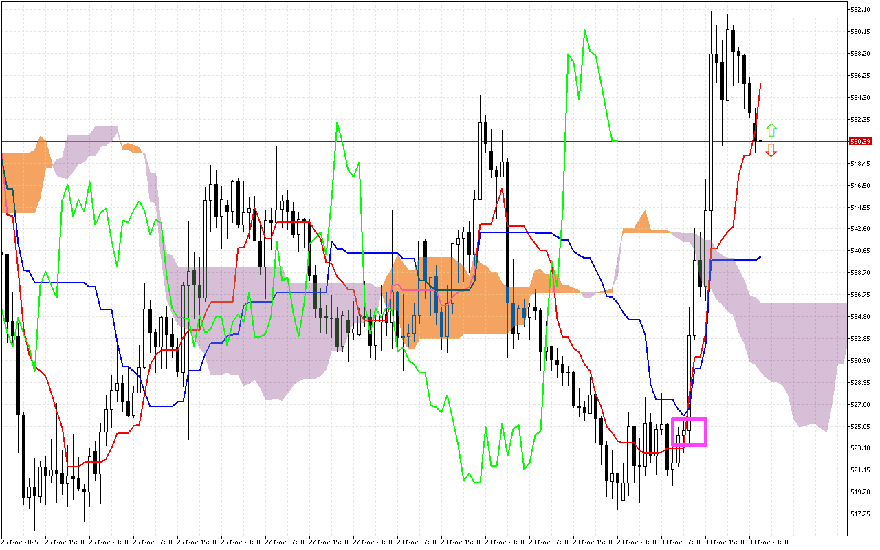 สัญญาณหลักประการหนึ่งของช่วงการซื้อขายครั้งก่อนคือจุดตัดของเส้น Tenkan และ Kijun ตำแหน่งนี้จะถูกทำเครื่องหมายด้วยสี่เหลี่ยมสีชมพูบนกราฟ การเพิ่มขึ้นของเส้น Tenkan เหนือ Kijun ถือเป็นสัญญาณเชิงบวก ซึ่งอาจบ่งบอกถึงการเปลี่ยนแปลงที่เป็นไปได้ในแนวโน้มขาขึ้น