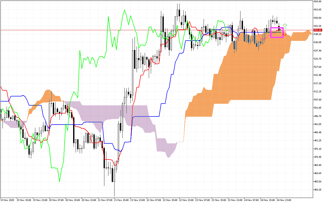Jẹ ki a farabalẹ wo awọn iye lọwọlọwọ ti awọn paati akọkọ ti Atọka Ichimoku lati ṣe ayẹwo ipo ọja lọwọlọwọ:
