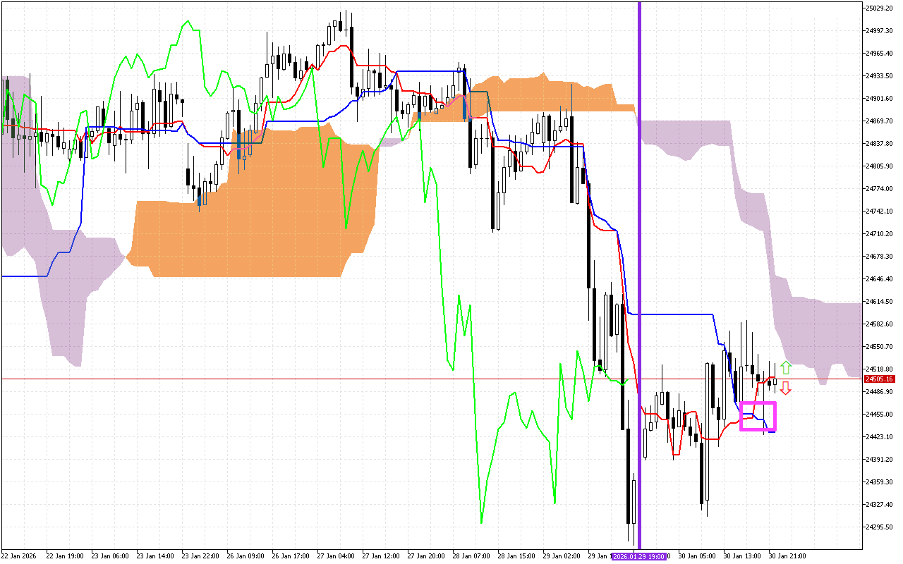 Jẹ ki a farabalẹ wo awọn iye lọwọlọwọ ti awọn paati akọkọ ti Atọka Ichimoku lati ṣe ayẹwo ipo ọja lọwọlọwọ: