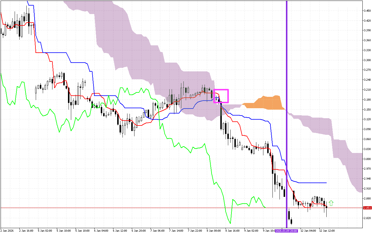 Ọkan ninu awọn ifihan agbara akọkọ ti awọn akoko iṣowo iṣaaju ni ikorita ti awọn ila Tenkan ati Kijun, agbegbe yii ni samisi pẹlu onigun mẹrin Pink lori aworan. Igbesoke laini Tenkan loke laini Kijun jẹ ifihan agbara rere, eyiti o le tọkasi iyipada ti o ṣeeṣe ninu aṣa si ọna oke.