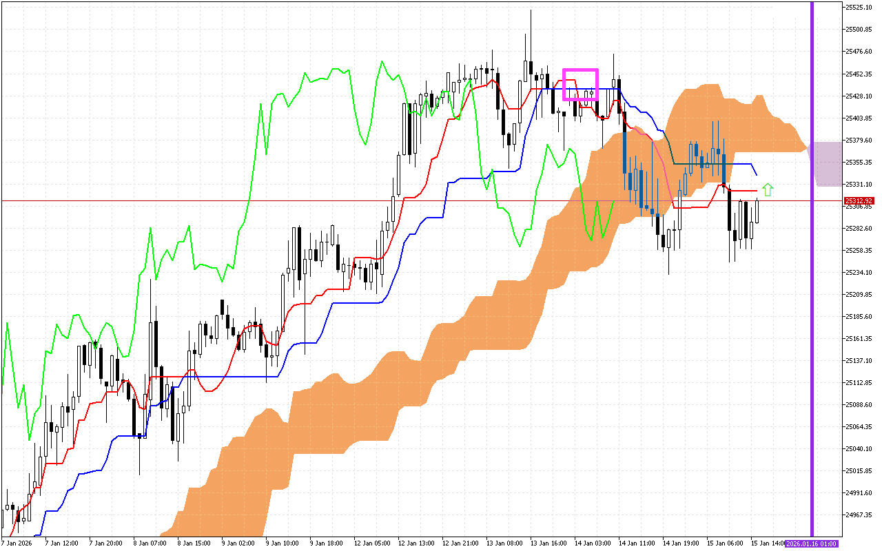 Awọn ipele atilẹyin ti o ni agbara wa lori laini Tenkan, ni ayika ami 25413.43, laini Kijun, ni ayika ami 25348.14, SenkouA laini, ni ami 25223.89, ati laini SenkouB, ni ayika ami 25148.94.