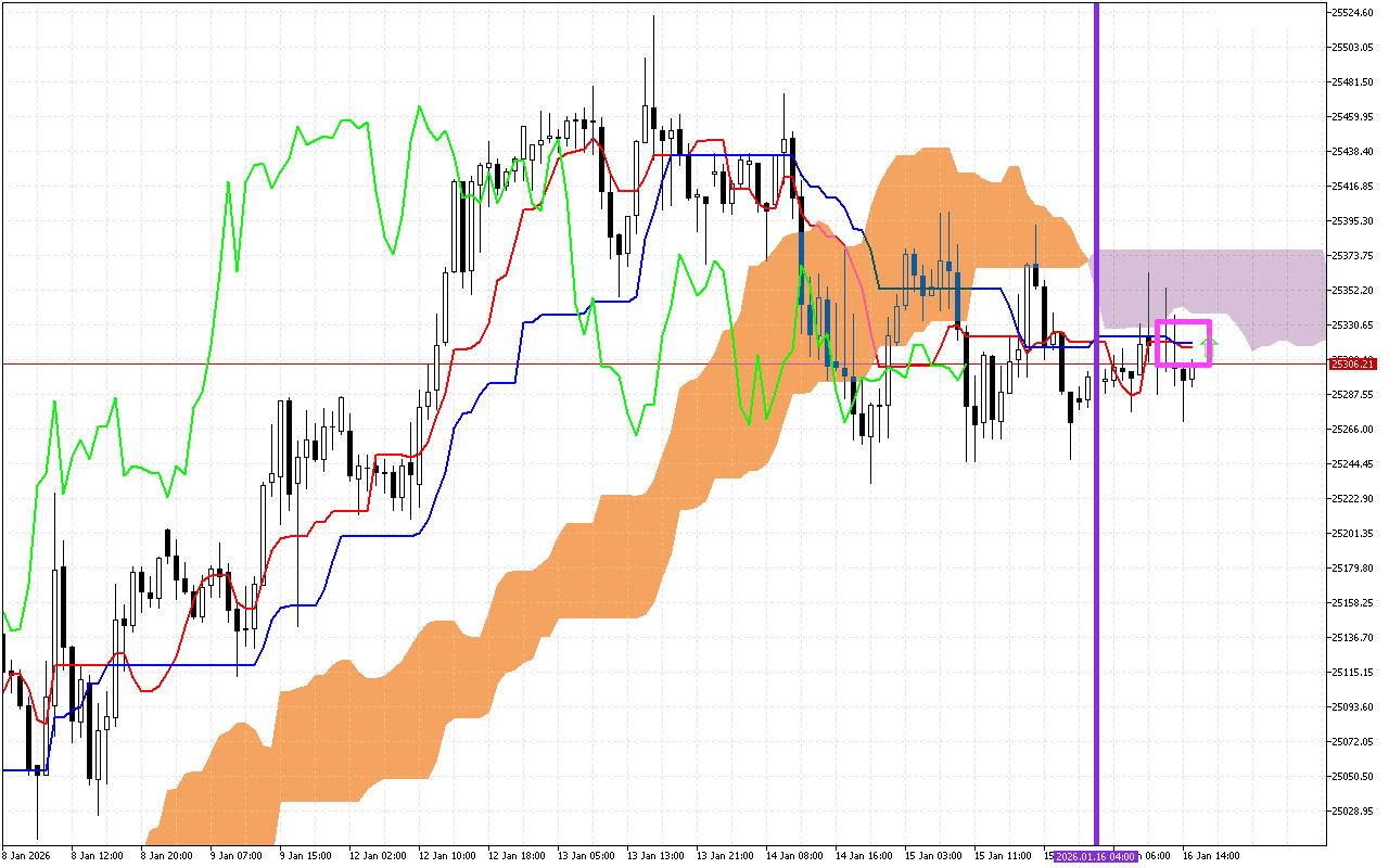 Awọn ipele resistance to ni agbara wa lori laini Tenkan, ni agbegbe 25316.71, laini Kijun, nitosi 25318.92, SenkouA naa laini, ni ipele ti 25341.79, ati laini SenkouB, ni ayika 25377.15.