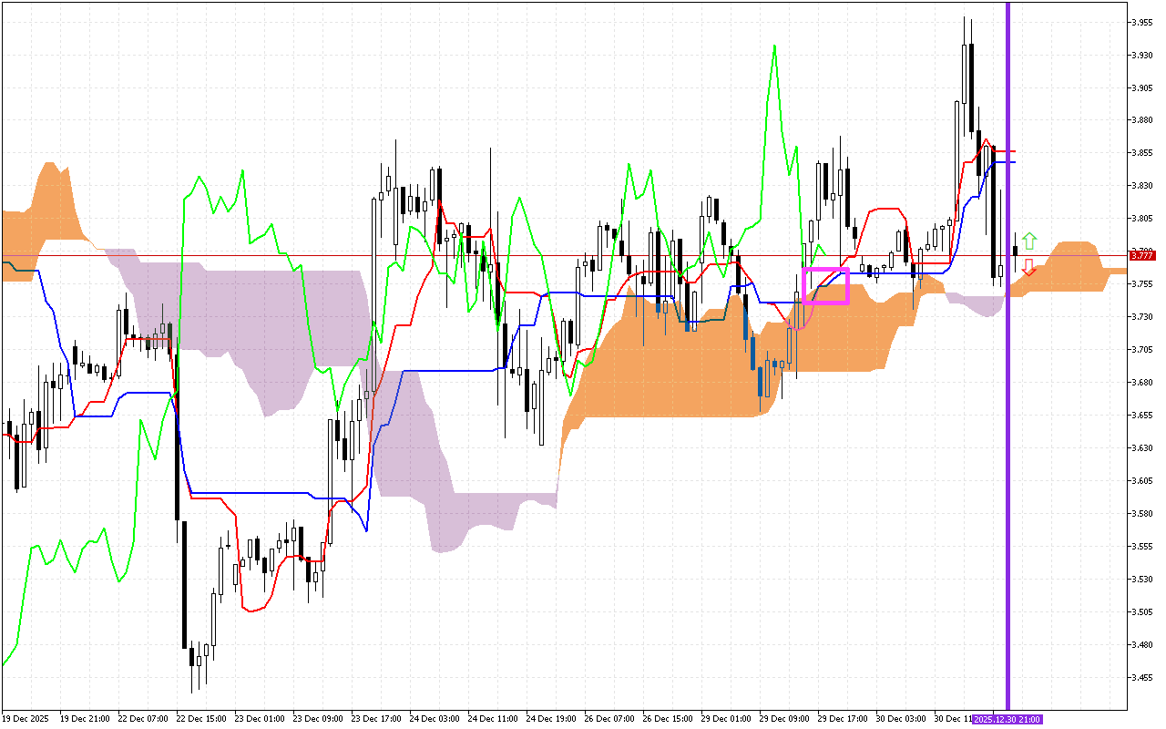 Jẹ ki a farabalẹ wo awọn iye lọwọlọwọ ti awọn paati akọkọ ti Atọka Ichimoku lati ṣe ayẹwo ipo ọja lọwọlọwọ: