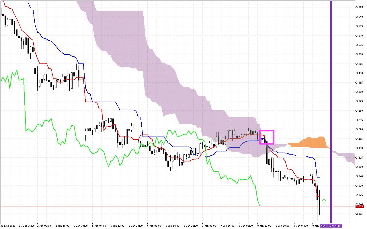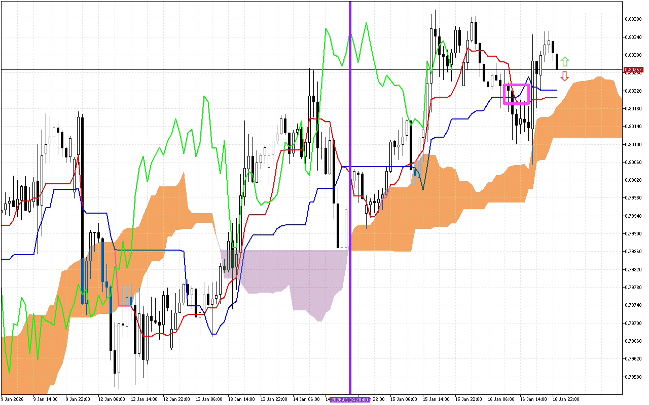 Ṣiṣayẹwo awọn akoko iṣowo iṣaaju, o tọ lati san ifojusi si ikorita ti awọn laini Tenkan ati Kijun, ti samisi pẹlu onigun mẹrin Pink kan. Laini iyara Tenkan ṣubu ni isalẹ laini Kijun, eyiti o maa n ṣe afihan iyipada aṣa si ọna isalẹ. Bibẹẹkọ, nigbamii idiyele naa dide loke laini Tenkan, eyiti o tọkasi ailagbara ti itara isalẹ.