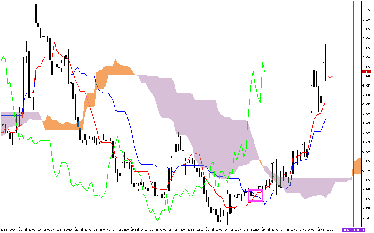 Ifihan agbara keji ti o ṣe pataki julọ jẹ iyipada si itọsọna ti iṣipopada ti awọsanma Kumo. Yi ifihan agbara ti wa ni samisi lori chart pẹlu inaro eleyi ti ila. Awọ osan ti awọsanma tọkasi iyipada ninu itọsọna pataki ti gbigbe si oke.