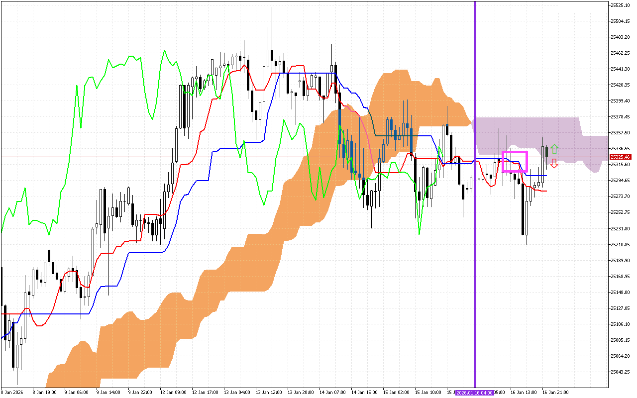 Awọn ipele atilẹyin ti o ni agbara wa lori laini Tenkan, ni ayika 25280.39, laini SenkouA, ni 25324.53, ati SenkouB naa ila, ni ayika 25377.15.