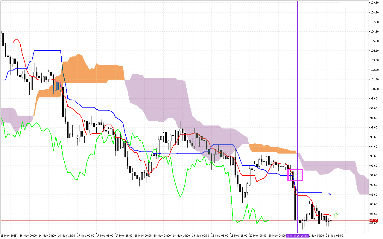 Jẹ ki a farabalẹ wo awọn iye lọwọlọwọ ti awọn paati akọkọ ti Atọka Ichimoku lati ṣe ayẹwo ipo ọja lọwọlọwọ: