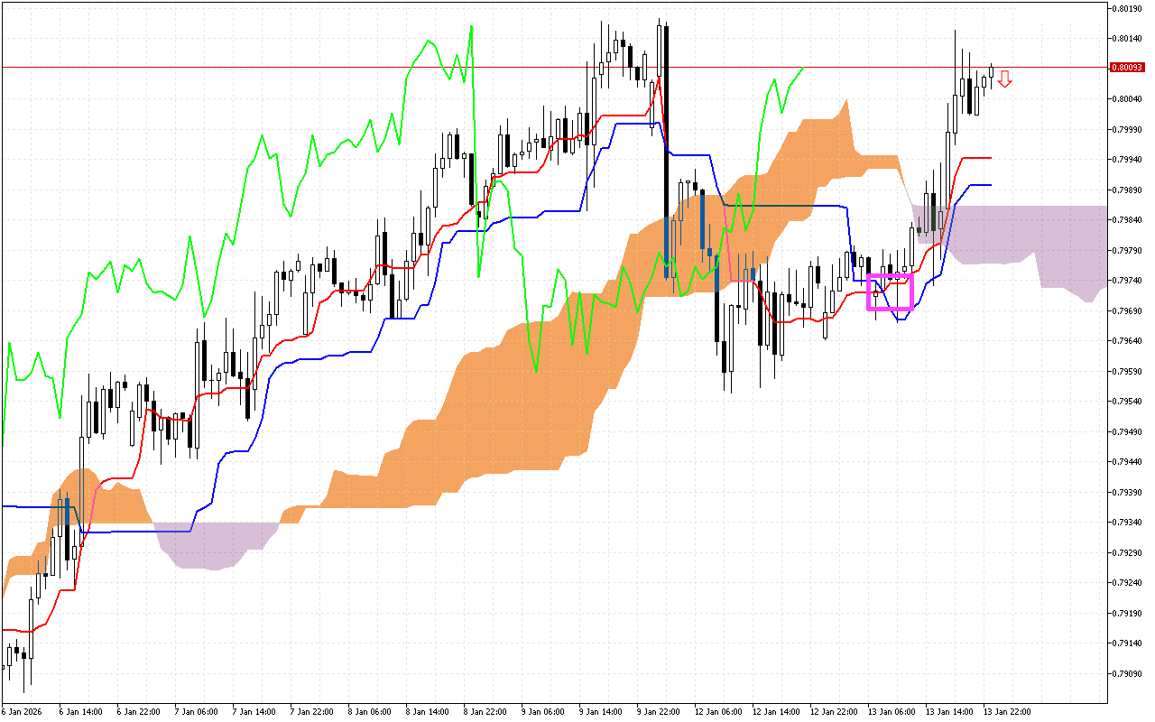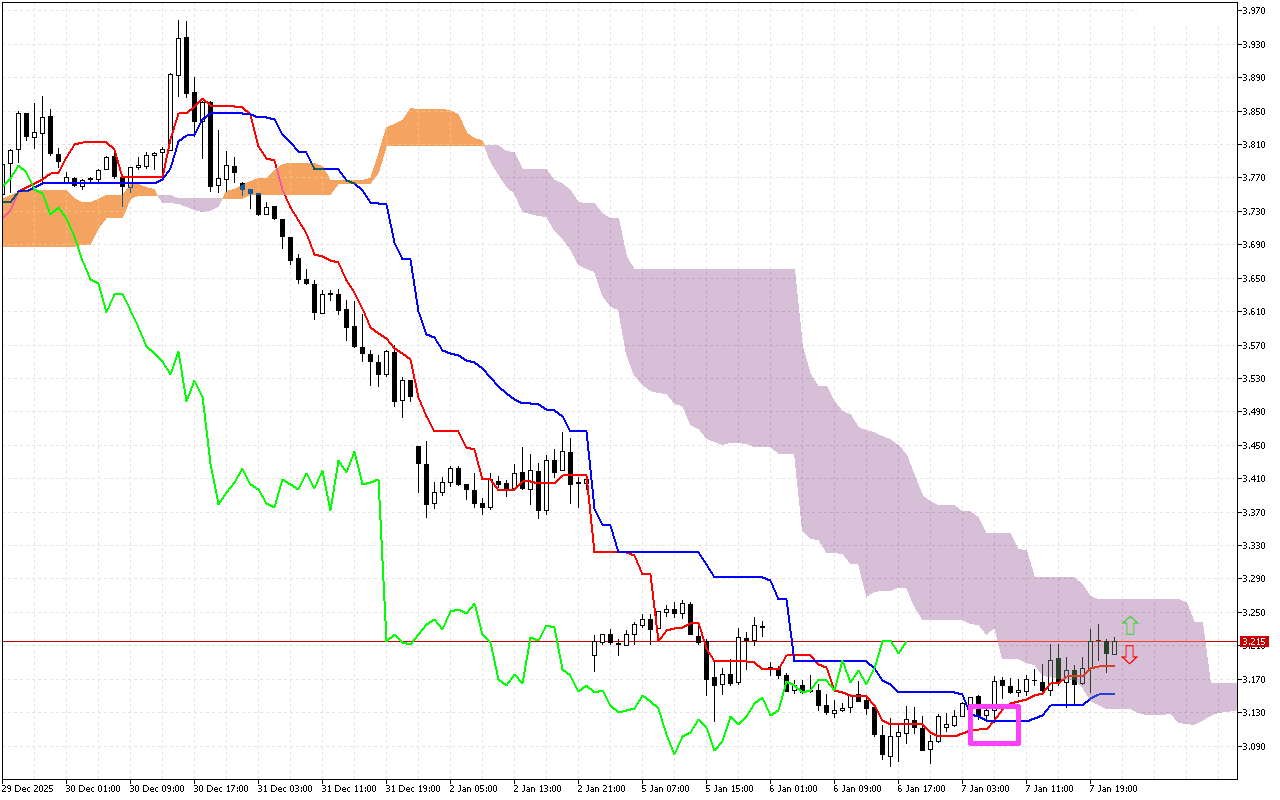 Jẹ ki a farabalẹ wo awọn iye lọwọlọwọ ti awọn paati akọkọ ti Atọka Ichimoku lati ṣe ayẹwo ipo ọja lọwọlọwọ: