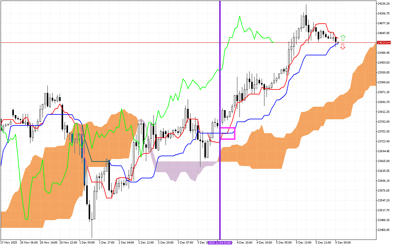 Awọn ipele atilẹyin ti o ni agbara wa lori laini Kijun, nitosi 24015.01, laini SenkouA, ni 23849.61, ati SenkouB laini, nitosi 23789.94.