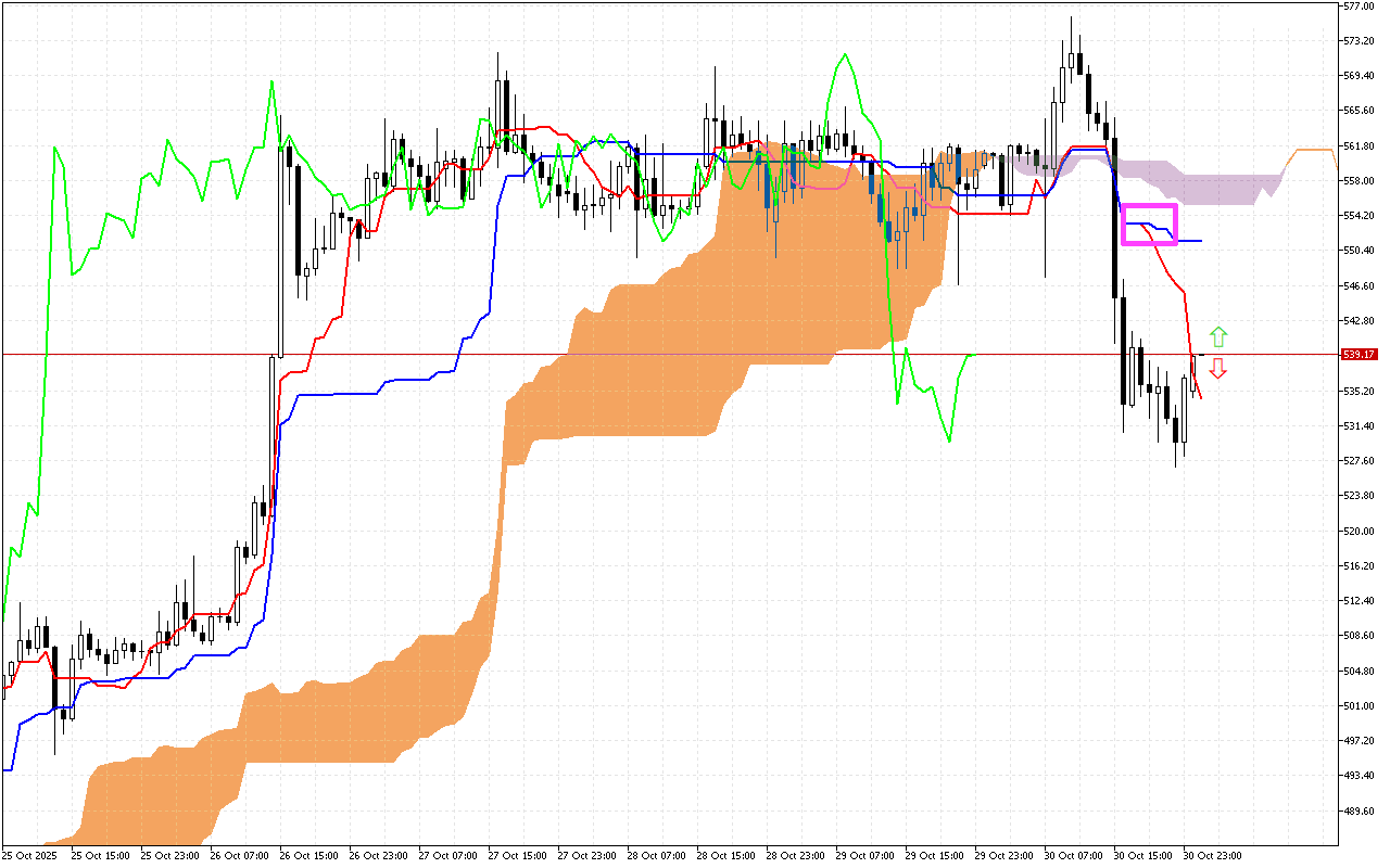 Ifihan agbara keji pataki julọ ni iyipada ni itọsọna ti awọsanma Kumo, ti a samisi pẹlu laini eleyi ti inaro. Iyipada ninu awọ awọsanma si Lilac tọkasi iyipada ti itọsọna pataki ti gbigbe si isalẹ.