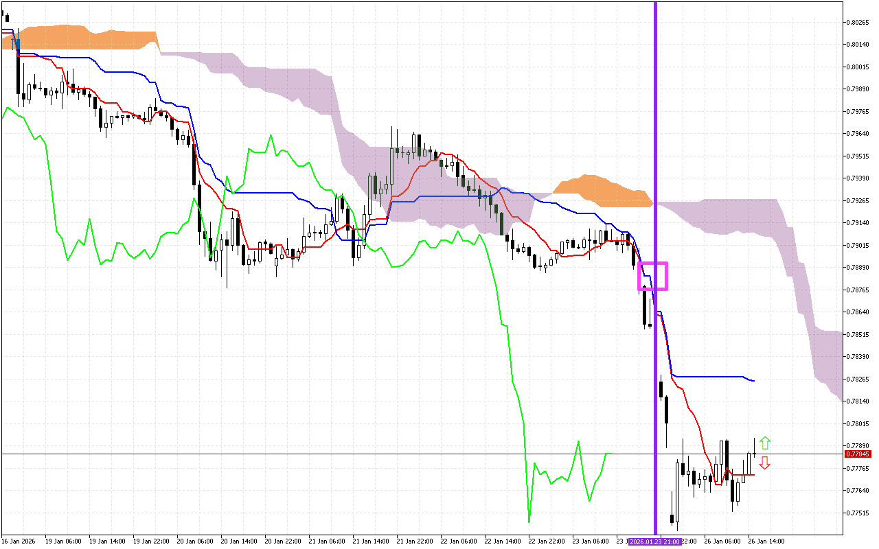 Ifihan agbara keji pataki julọ ni iyipada ni itọsọna ti awọsanma Kumo, ti a samisi pẹlu laini eleyi ti inaro. Iyipada ninu awọ awọsanma si Lilac tọkasi iyipada ti itọsọna pataki ti gbigbe si isalẹ.