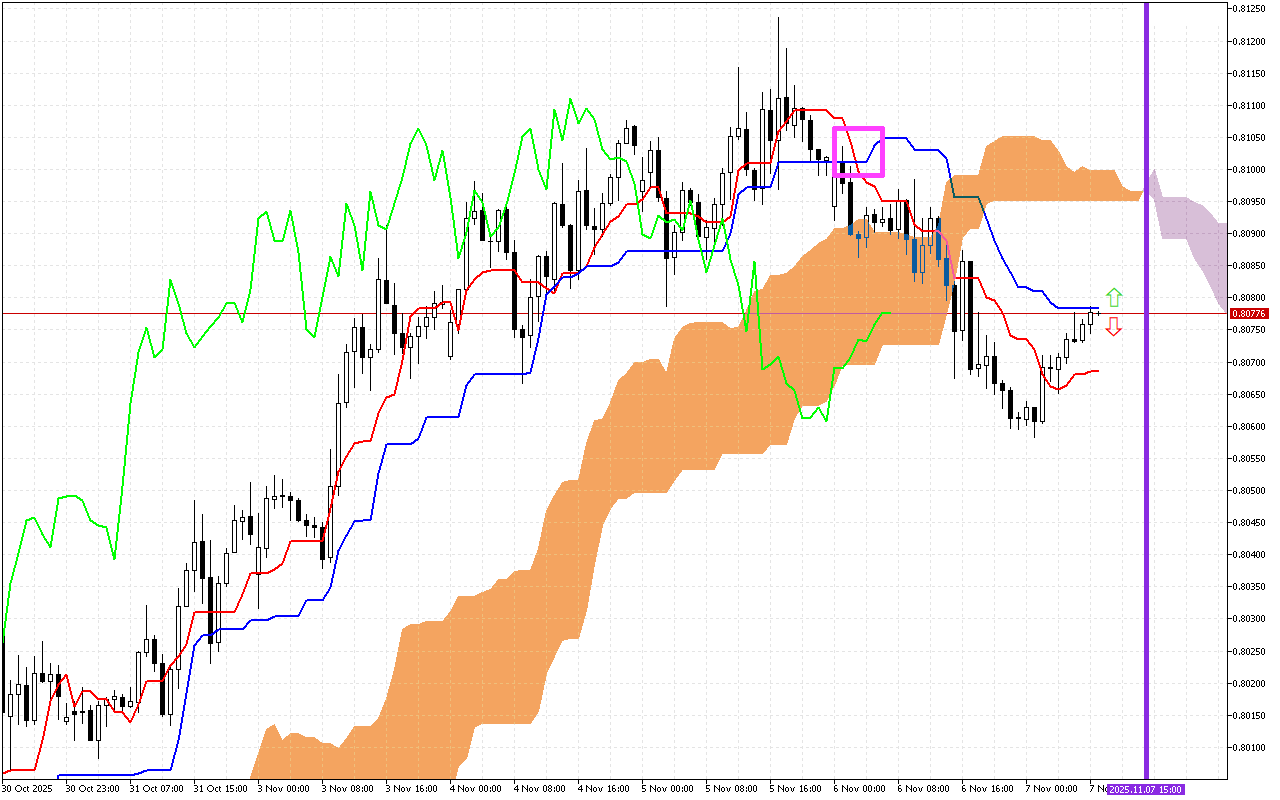 Jẹ ki a farabalẹ wo awọn iye lọwọlọwọ ti awọn paati akọkọ ti Atọka Ichimoku lati ṣe ayẹwo ipo ọja lọwọlọwọ: