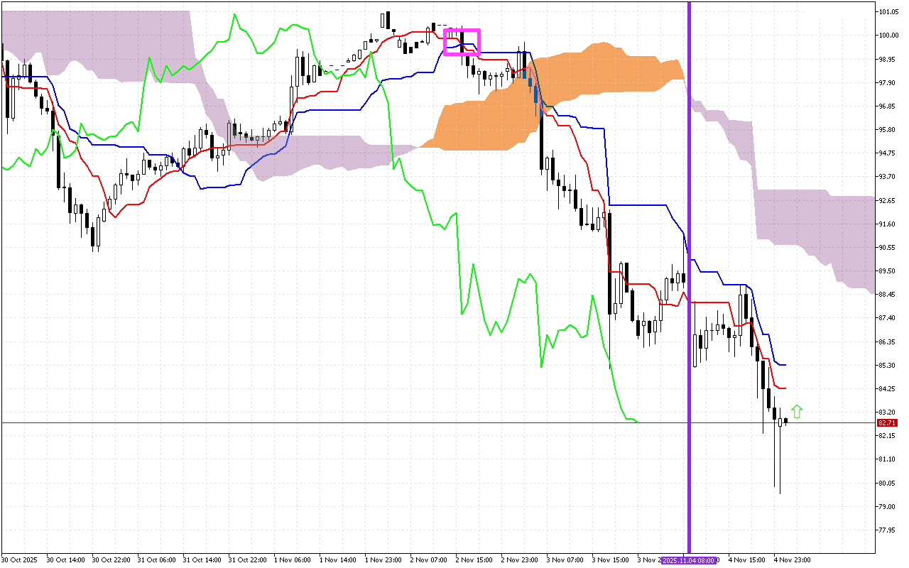 Ifihan agbara keji pataki julọ ni iyipada ni itọsọna ti awọsanma Kumo, ti a samisi pẹlu laini eleyi ti inaro. Iyipada ninu awọ awọsanma si Lilac tọkasi iyipada ti itọsọna pataki ti gbigbe si isalẹ.