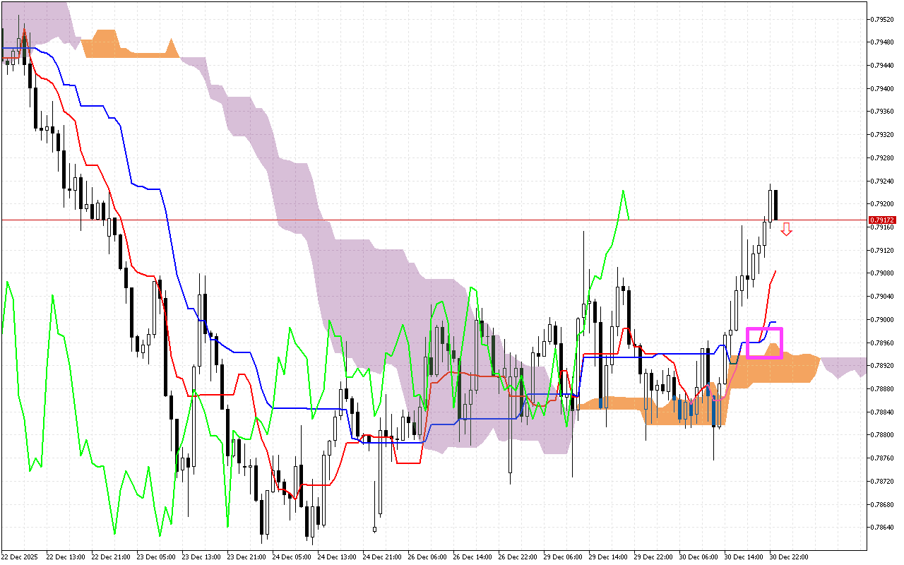 Jẹ ki a farabalẹ wo awọn iye lọwọlọwọ ti awọn paati akọkọ ti Atọka Ichimoku lati ṣe ayẹwo ipo ọja lọwọlọwọ: