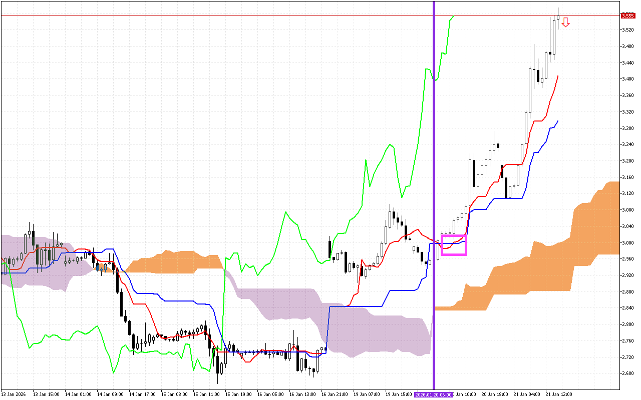 Ifihan akọkọ ti awọn akoko iṣowo tuntun ni ikorita ti awọn laini Tenkan ati Kijun, ti samisi lori aworan apẹrẹ pẹlu onigun mẹrin Pink kan. Eyi jẹ ifihan agbara odi. O tọkasi iyipada ninu aṣa ti n bọ si isalẹ.