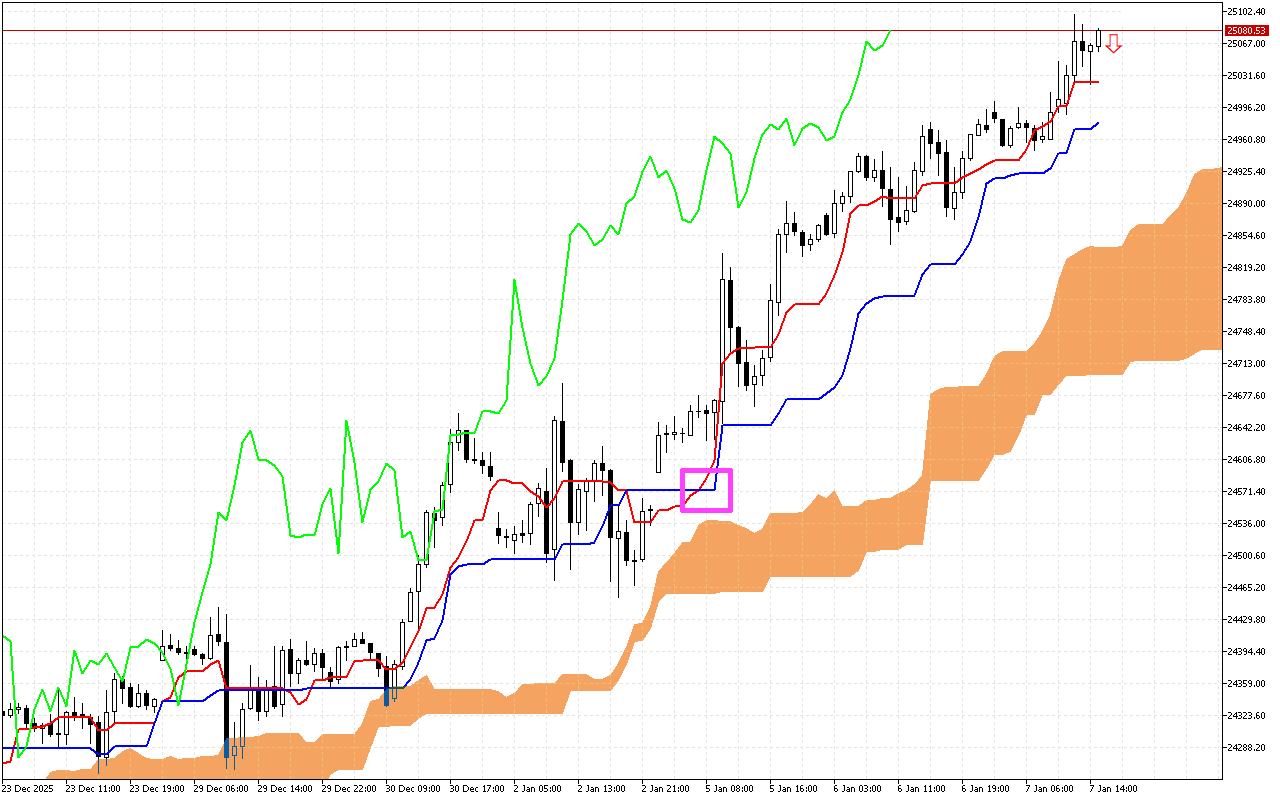 Laini Chikou, eyiti o ṣafihan idiyele pipade pẹlu aisun awọn akoko 26, ga ju idiyele lọwọlọwọ lọ.