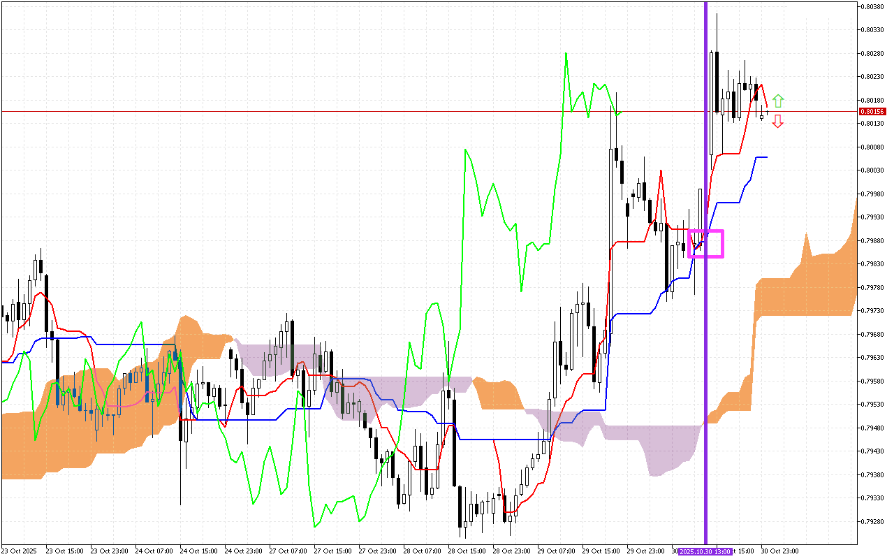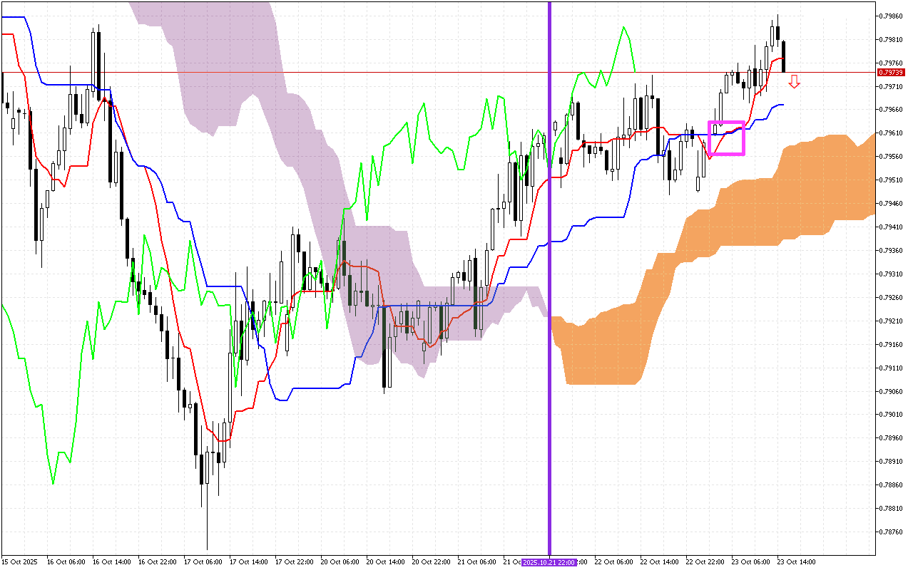 Laini Tenkan wa loke laini Kijun, ṣugbọn idiyele ti lọ silẹ ni isalẹ awọn laini wọnyi ati pe o wa ni isalẹ wọn.