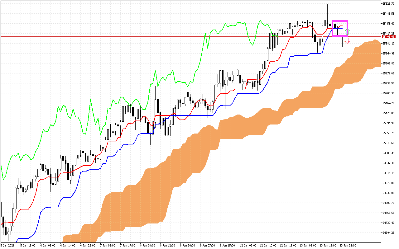 Ṣiṣayẹwo awọn akoko iṣowo iṣaaju, o tọ lati san ifojusi si ikorita ti awọn laini Tenkan ati Kijun, ti samisi pẹlu onigun mẹrin Pink kan. Laini iyara Tenkan ṣubu ni isalẹ laini Kijun, eyiti o maa n ṣe afihan iyipada aṣa si ọna isalẹ. Bibẹẹkọ, nigbamii idiyele naa dide loke laini Tenkan, eyiti o tọkasi ailagbara ti itara isalẹ.