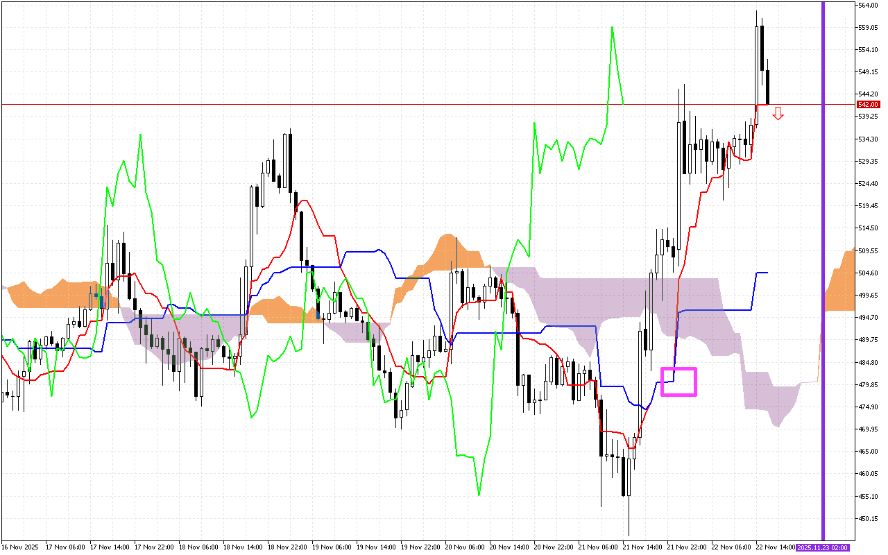 Awọn agbara gbigbe owo lori ijinna to gun jẹ ipinnu nipasẹ awọsanma Kumo, eyiti o ni awọ osan ni bayi. Nitorinaa, ifihan agbara yii ṣe pataki si fekito oke ti gbigbe idiyele ni ọjọ iwaju.