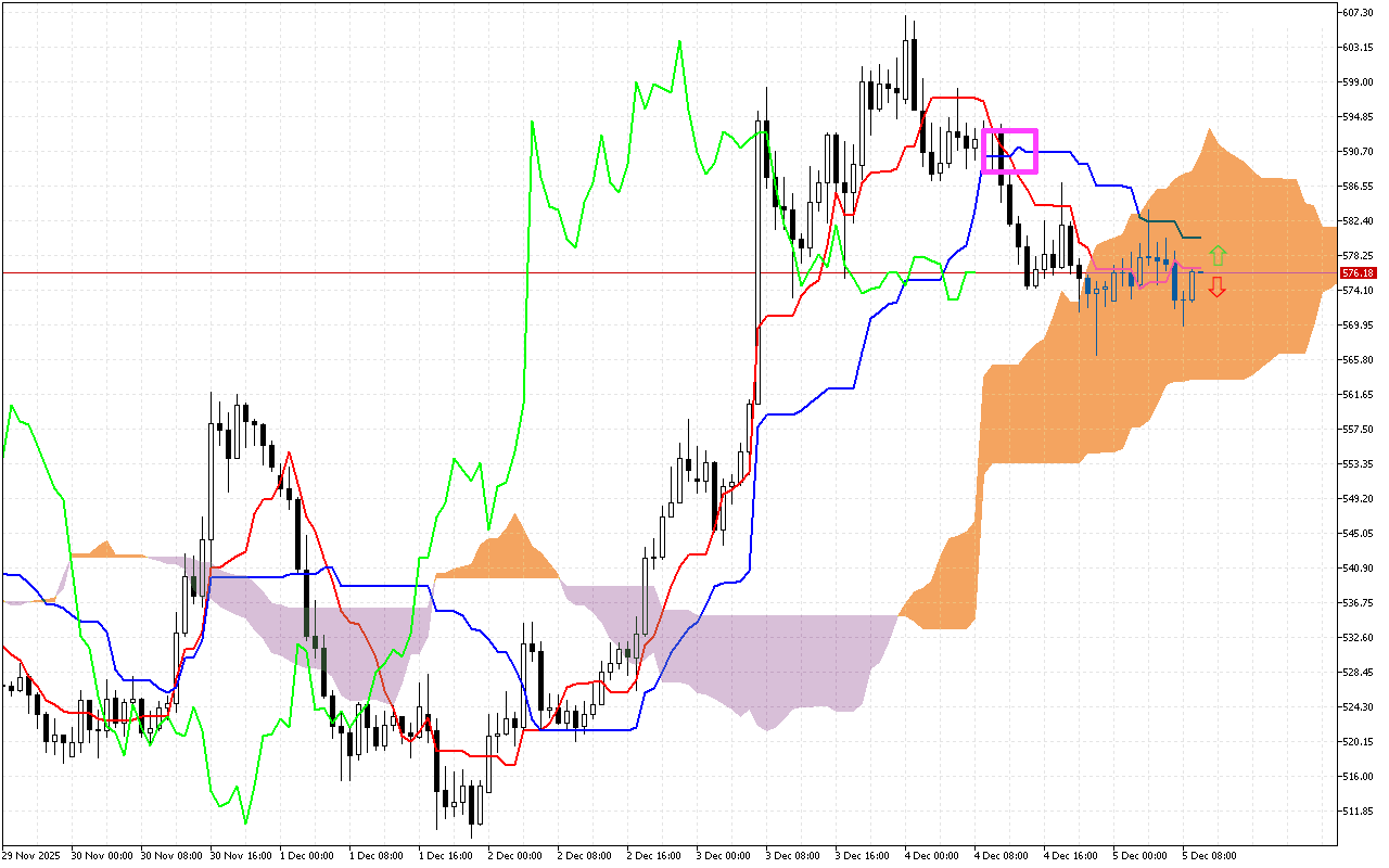Jẹ ki a farabalẹ wo awọn iye lọwọlọwọ ti awọn paati akọkọ ti Atọka Ichimoku lati ṣe ayẹwo ipo ọja lọwọlọwọ: