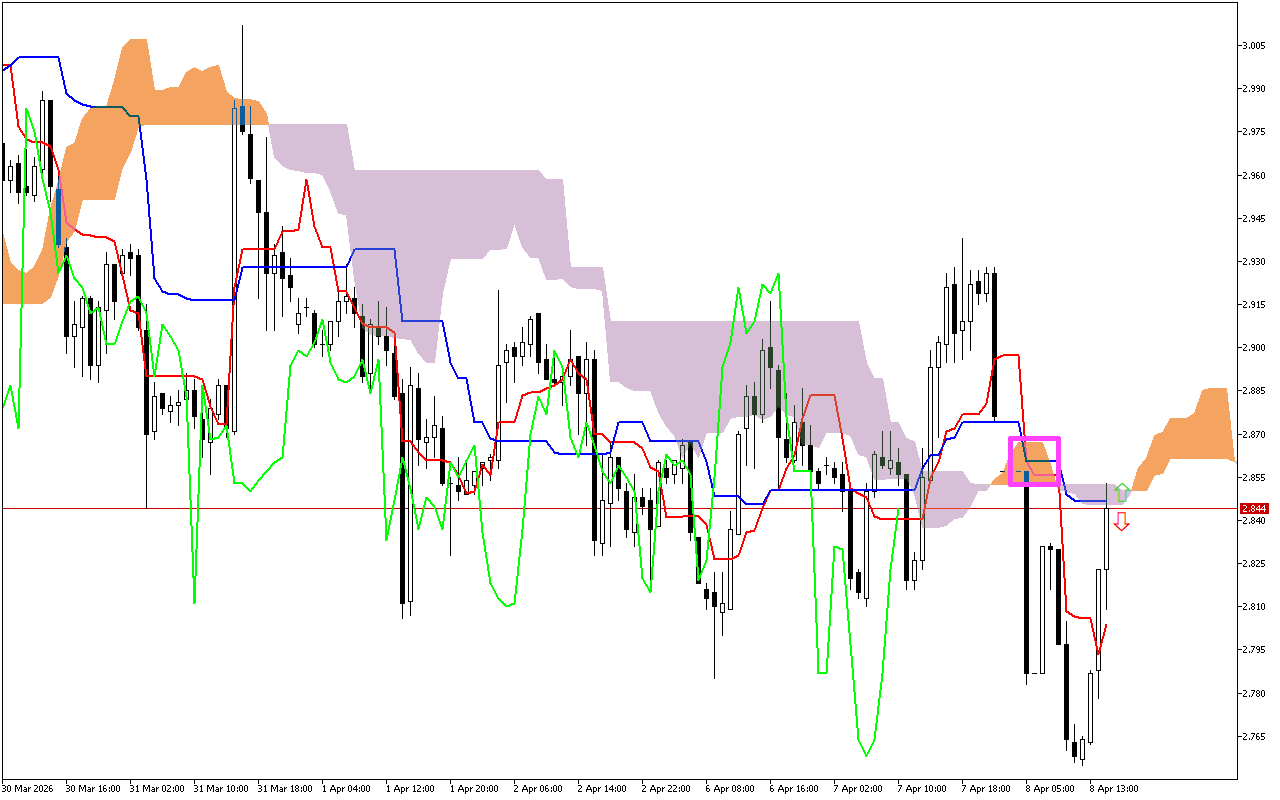 Enye yezimpawu eziyinhloko zezikhathi zokuhweba zangaphambilini kwaba ukuphambana kwemigqa ye-Tenkan kanye ne-Kijun. Le ndawo imakwe ngesikwele esiphinki egrafu. Ukukhuphuka komugqa we-Tenkan ngaphezu komugqa we-Kijun kuyisignali evumayo, engabonisa ushintsho olungenzeka kuthrendi ukuya phezulu.