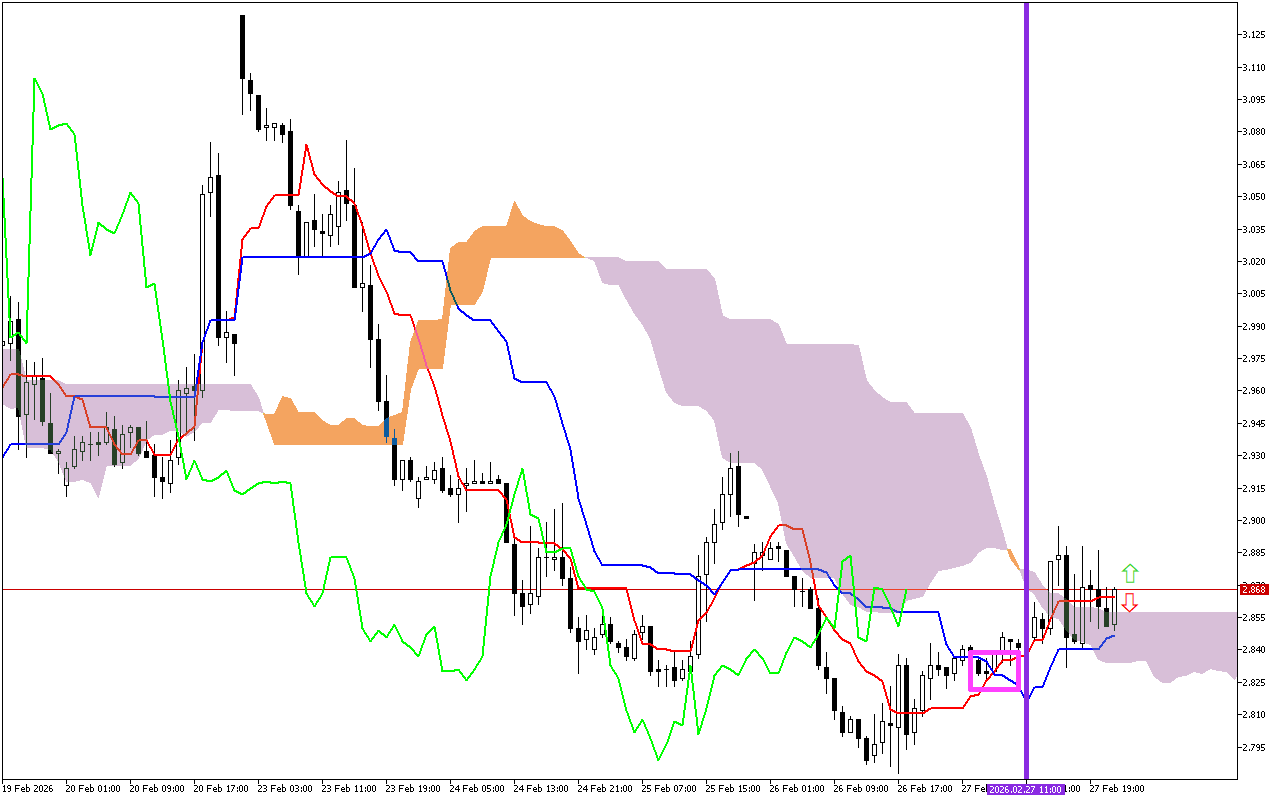 Isignali eyinhloko yamaseshini akamuva okuhweba impambana yolayini Tenkan kanye ne-Kijun, emakwe eshadini ngesikwele esipinki. Lesi isignali engalungile. Kubonisa ushintsho kuthrendi ezayo iye kweya phansi.