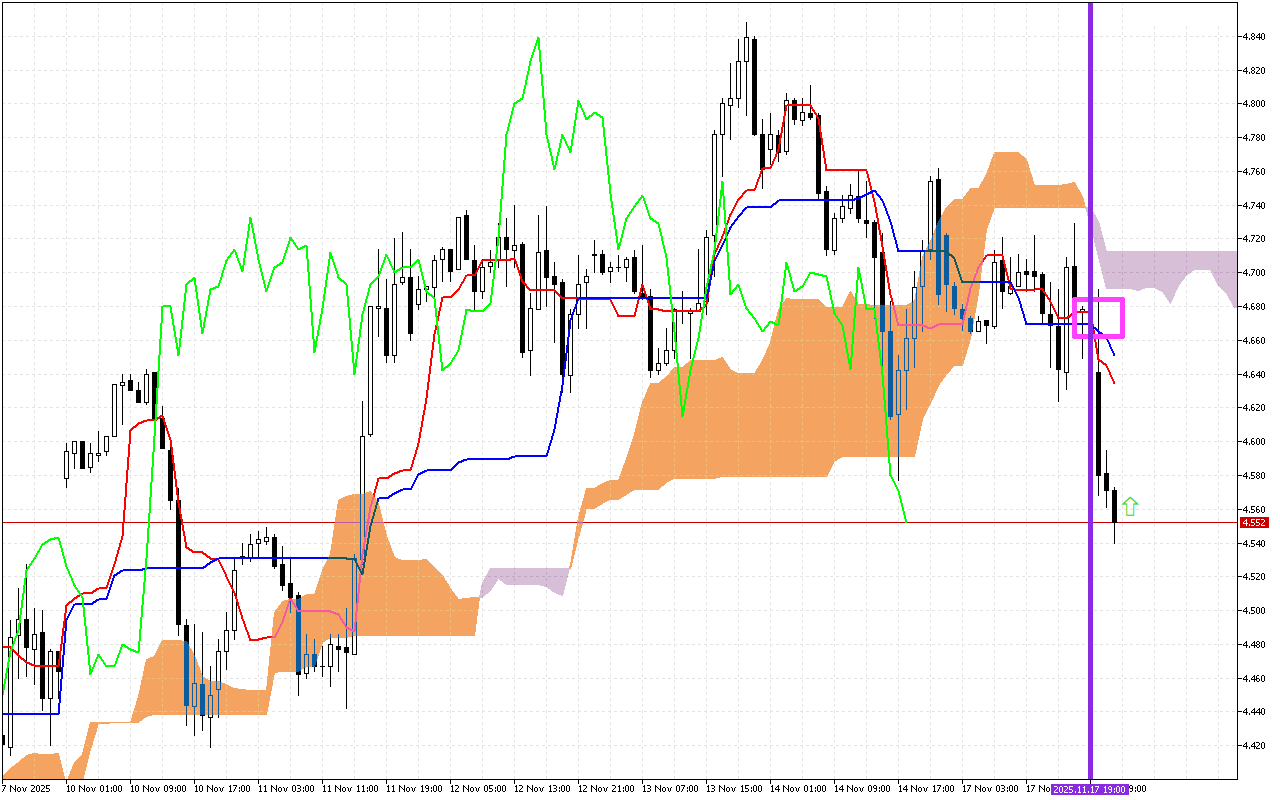 Ukuhlaziywa kwesimo semakethe, okuthuthukiswe ngezikhathi zokuhweba ezidlule, kubonisa ukuphambana kwemigqa ye-Tenkan kanye ne-Kijun. Ngokuvamile, lesi siginali ikhombisa ukunyuka okuzayo, kodwa intengo yehle ngaphansi komugqa we-Tenkan.