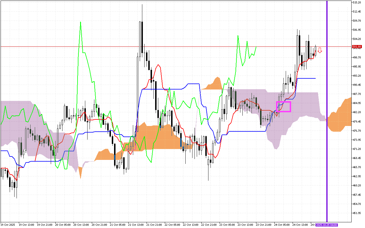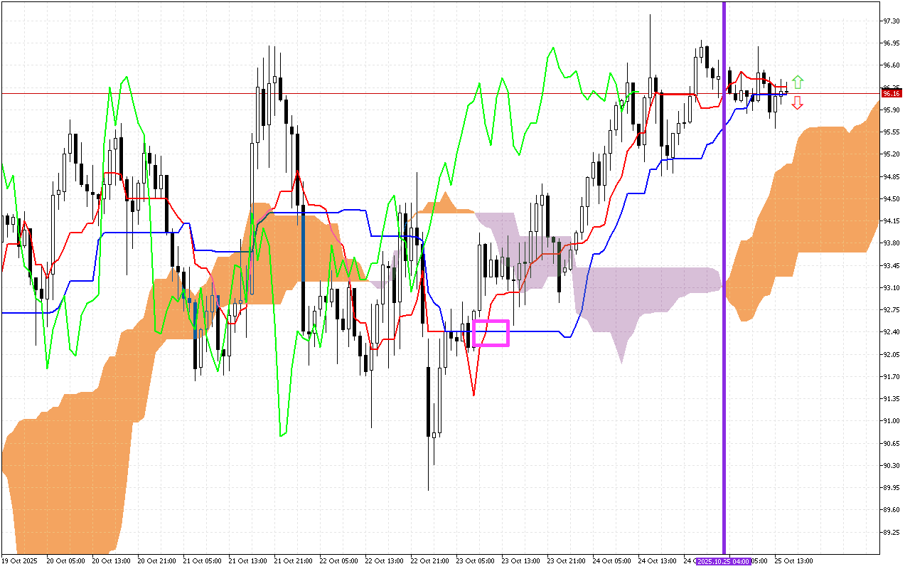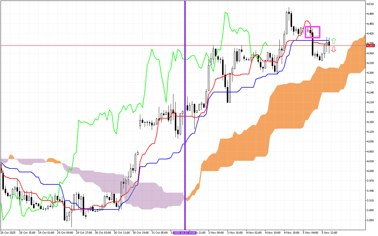 Isikhathi esibalulekile sezikhathi zokuhweba zangaphambilini kwaba ukuphambana kwemigqa ye-Tenkan kanye ne-Kijun. Le signali imakwe eshadini ngesikwele esiphinki futhi ikhombisa ushintsho kuthrendi ukuya kweyokwehlayo. Nokho, ngokuhamba kwesikhathi intengo yaqashelwa ukuthi ikhuphuke ngaphezu komugqa we-Tenkan, okubonisa ubuthakathaka ekukhuphukeni kokwehla.