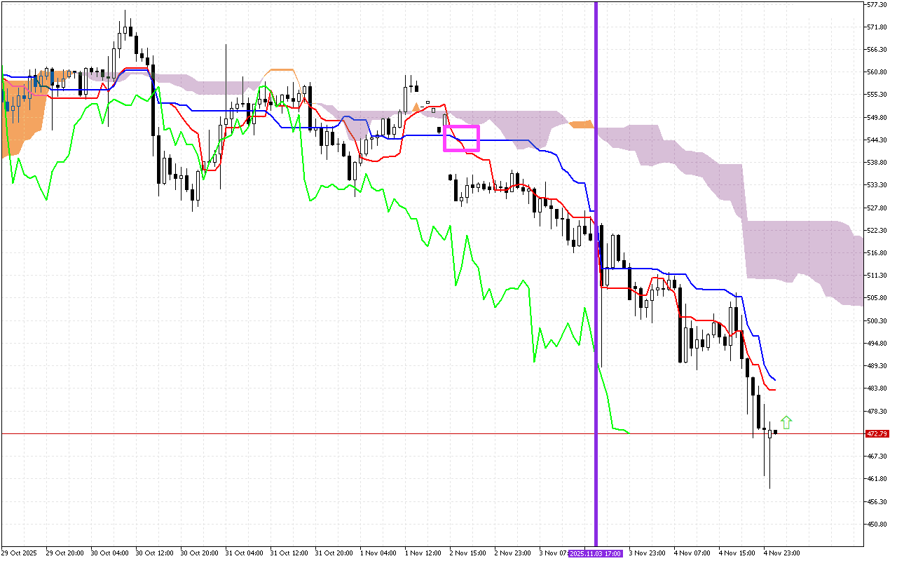 Ukuhlaziya izikhathi zokuhweba zangaphambilini, kufanelekile ukunaka impambana yolayini Tenkan kanye ne-Kijun, emakwe ngesikwele esipinki. Ulayini osheshayo we-Tenkan wehle ngaphansi kolayini we-Kijun, ovame ukuphawula ushintsho lwethrendi ukuya kweyokwehlayo. Nokho, ngokuhamba kwesikhathi intengo yenyuka ngaphezu komugqa we-Tenkan, okubonisa ubuthakathaka bomfutho ophansi.