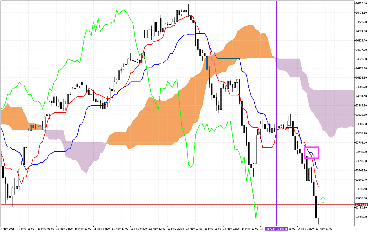 Isignali eyinhloko yamaseshini akamuva okuhweba impambana yolayini Tenkan kanye ne-Kijun, emakwe eshadini ngesikwele esipinki. Lesi isignali engalungile. Kubonisa ushintsho kuthrendi ezayo iye kweya phansi.